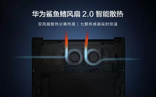 这一切的巧妙结合绝非偶然,既要解决CPU/GPU的高效散热问题,又要兼顾机身重量和厚度问题。华为工程师首创的“鲨鱼鳍2.0”散热系统,在华为 MateBook 13有限的内部空间植入了两枚效仿鲨鱼鳍流线造型的扇叶,提高了25%的进风量,减少3分贝的噪音值,完美压制了高性能CPU/GPU的发热量。