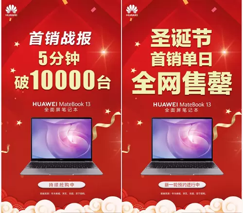 早在12月17日,华为就宣布新一代笔记本MateBook 13系列将在圣诞节当天10:00开卖,并提前了一个礼拜进行蓄势。就在12月25日上午10点05分,华为MateBook 13在开售后短短5分钟便狂销一万台,刷新了华为笔记本首销成绩,更在圣诞节首销当日全网售罄,成为了5K-7K主流轻薄本爆款!
