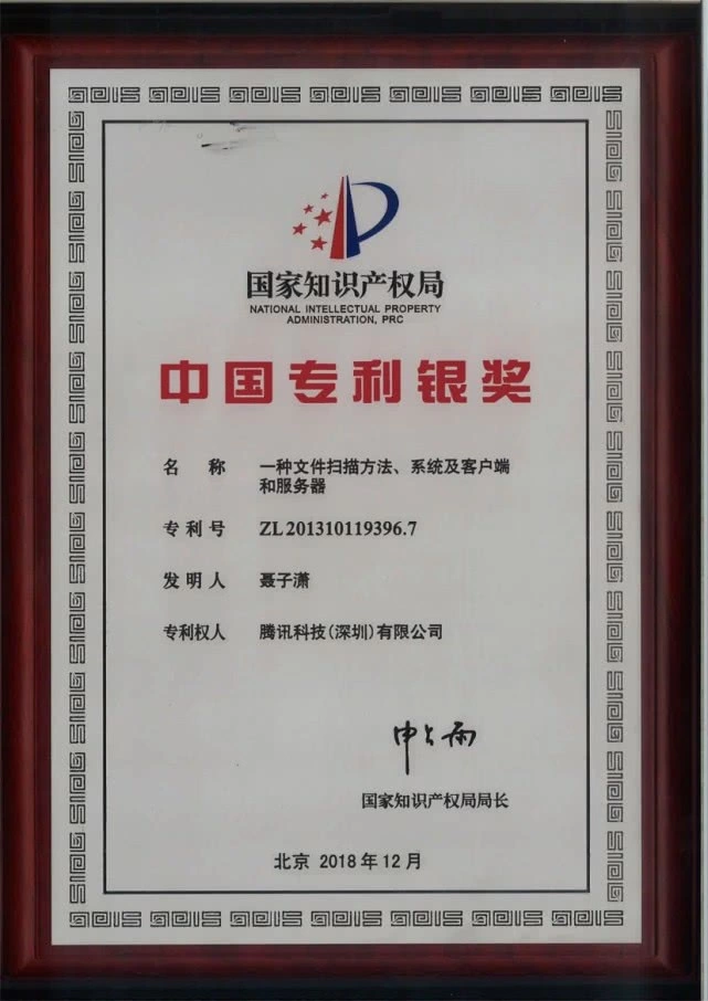 (图:腾讯电脑管家获第二十届中国专利银奖)