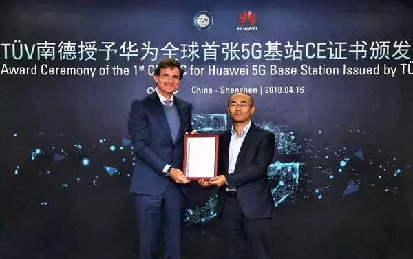 4月,TUV 南德意志集团向华为颁发TUV SUD全球首张5G 产品欧盟无线设备指令型式认证证书,标志着华为5G产品获得欧盟公告机构认可。