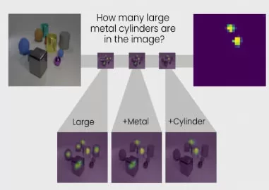 那么它怎么能回答像“大金属立方体是什么颜色”这样的问题呢?首先,模块会隔离大对象。然后第二个模块将识别哪些对象是金属。第三个将查找符合先前标准的立方体,最后,第四个将确定对象的颜色。