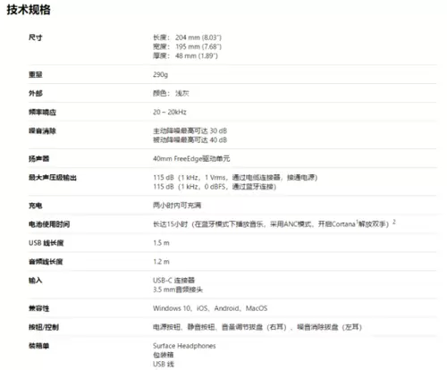 Surface Headphones无线耳机支持“Hey Cortana”语音唤醒,无需手动按下按钮即可进行音乐播放操控。耳机配备了8个麦克风,支持蓝牙4.2,可以与Surface笔记本产品配合使用,也可以用于其他移动蓝牙设备,包括iOS、安卓以及macOS设备等。Surface Headphones无线耳机的充电接口为USB-C,支持快充,用户只需充电5分钟便可获得1小时音乐续航。电池整体续航时间为15小时蓝牙使用或50小时插线使用。