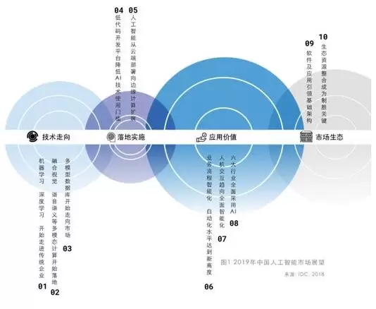 IDC预计,2022年,中国人工智能市场规模将达到98.4亿美元。白皮书从技术走向、落地实施、应用价值、市场生态四个维度预测了2019年人工智能十大趋势:
