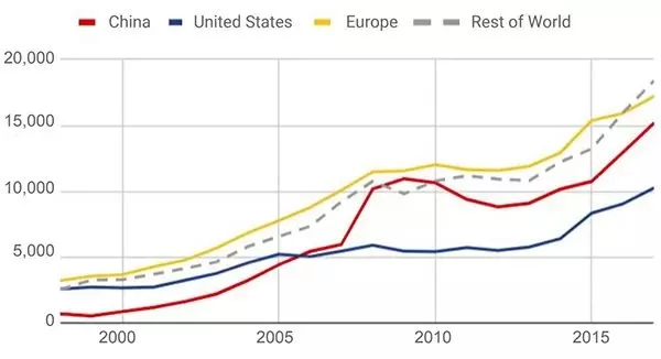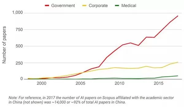 从地区上看,过去19年间欧洲始终占据人工智能研究领域的鳌头。根据Scopus的数据,2017年28%的人工智能研究来自欧洲,中国发表的人工智能领域的论文占25%,美国占17%。从2007年至2017年,中国发表的论文数量增长了150%。