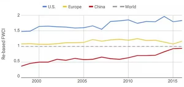 人工智能指数报告按世界平均值计算影响力用“改良版(Re-based)”FWCI衡量各国在人工智能研究领域的影响力。FWCI指的是领域权重引用影响系数。过去18年,美国平均每位AI论文作者的被引率始终高于欧洲,比全球平均水平高83%。与2000年相比,2016年平均每位中国AI论文作者的引用率增长了44%。