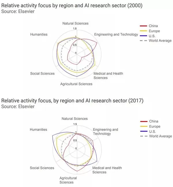 从细分学科上看,2000年美国的AI研究在人文科学、农业、社会科学、医学药学和工程技术上均有覆盖,到2017年,美国及欧洲在人工智能上重点研究侧重于人文科学和医学健康学上,中国则加强了在工程技术和农业科学上的人工智能研究,在医学健康学上有所加强,但人文科学上的相关研究始终较为薄弱。