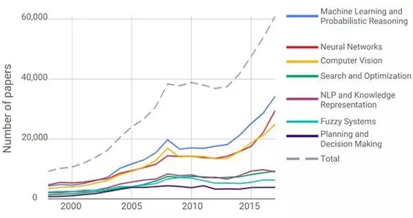 根据全球最大的文献摘要与科研信息引用数据库Scopus的数据,从1996年到2017年,计算机科学领域的年发表论文数量增长了约五倍,人工智能领域的年发表论文数量增长了约七倍。相比之下,总体所有学科的年发表论文在21年间增长了不到两倍。