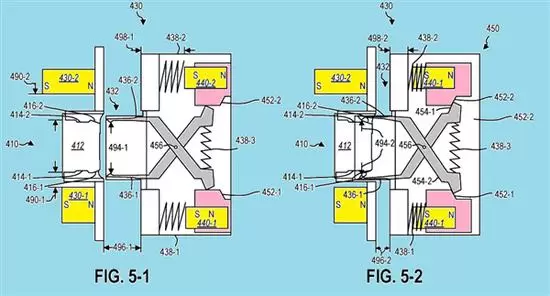 微软的这种磁吸式设计在普通USB-C的基础上,在数据线和插座两段都加装了磁铁(下图中黄色的430/440),同时在数据线一端还有弹簧锁定,当数据线和插座靠近时只用磁力就可以保持连接。