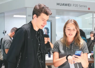 在德国柏林举行的国际消费电子展上,华为公司展区的工作人员向参观者介绍一款华为手机。