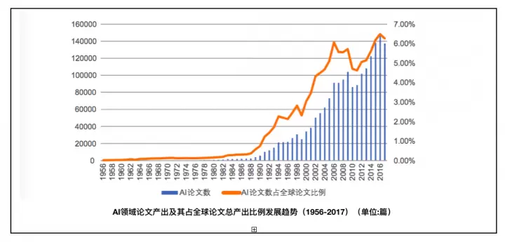 据《2018人工智能发展报告》显示,人工智能领域的全球论文近年来已达到每年10万篇以上的数量。占全球论文的比例也在逐年上升,得到科研人员越来越多的关注。