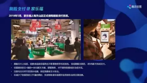 在支付领域,腾讯优图帮助微众银行实现了远程开户的功能。2018年,腾讯还与家乐福联手打造了合作下的首家智慧门店“Le Marche”。在这家智慧零售门店中,腾讯智慧零售工具矩阵会全部投入使用,赋能零售全链条。