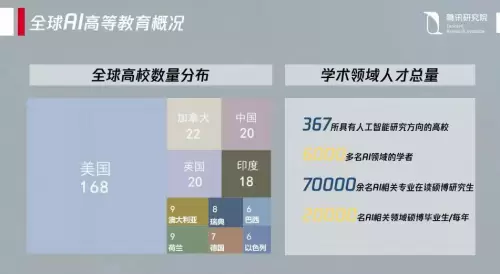 在全球的人工智能高校里,美国拥有人工智能研究能力的高校是168家,占据全球367所人工智能高校的50%以上。中国在2017年仅有20多所,2018年上升到了50多所。整体来说,全球需要的人工智能人才数量超过百万,供不应求。