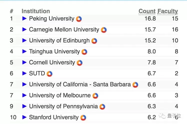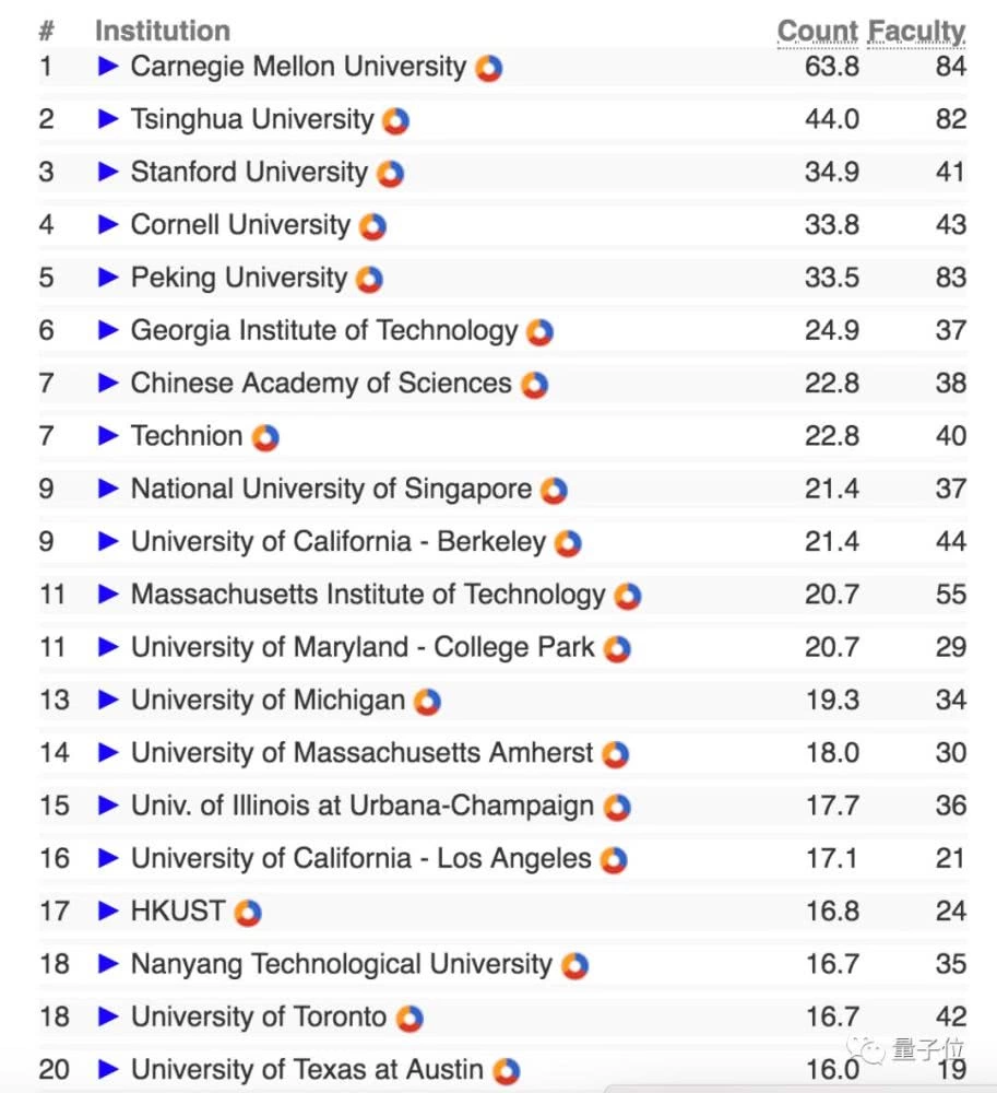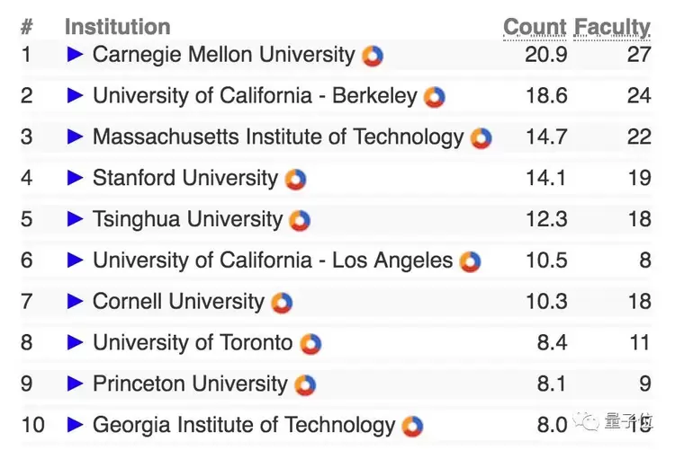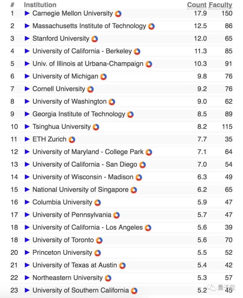 其中,CMU以17.9的高分领先于12.5分的MIT,清华8.2分跻身前十。