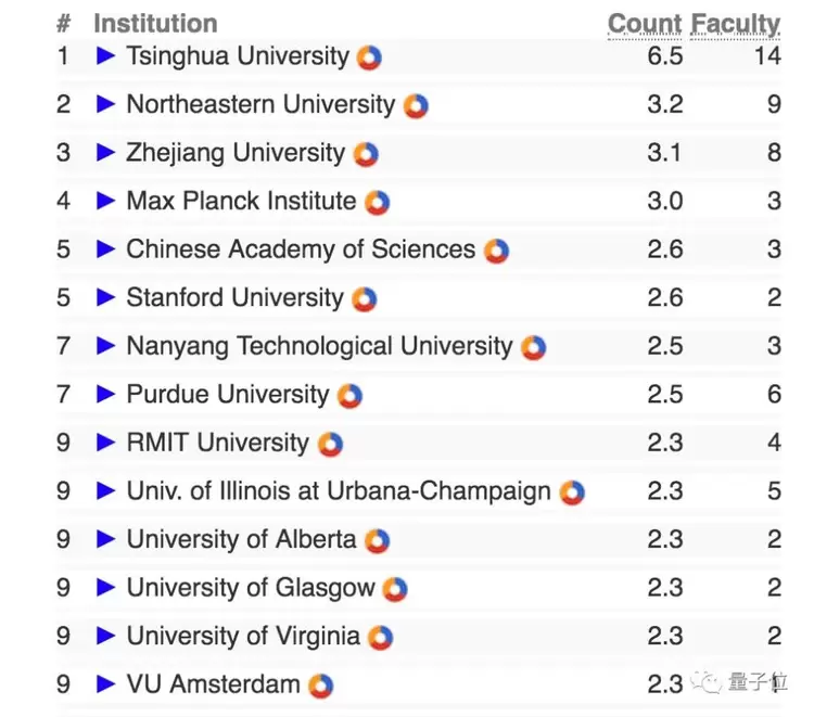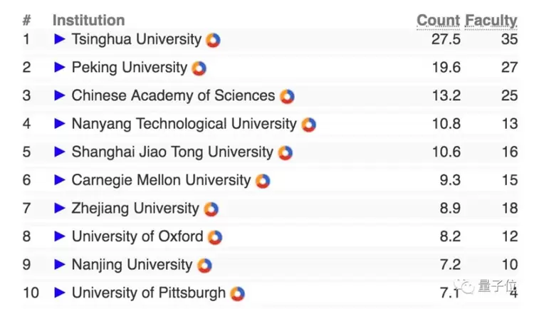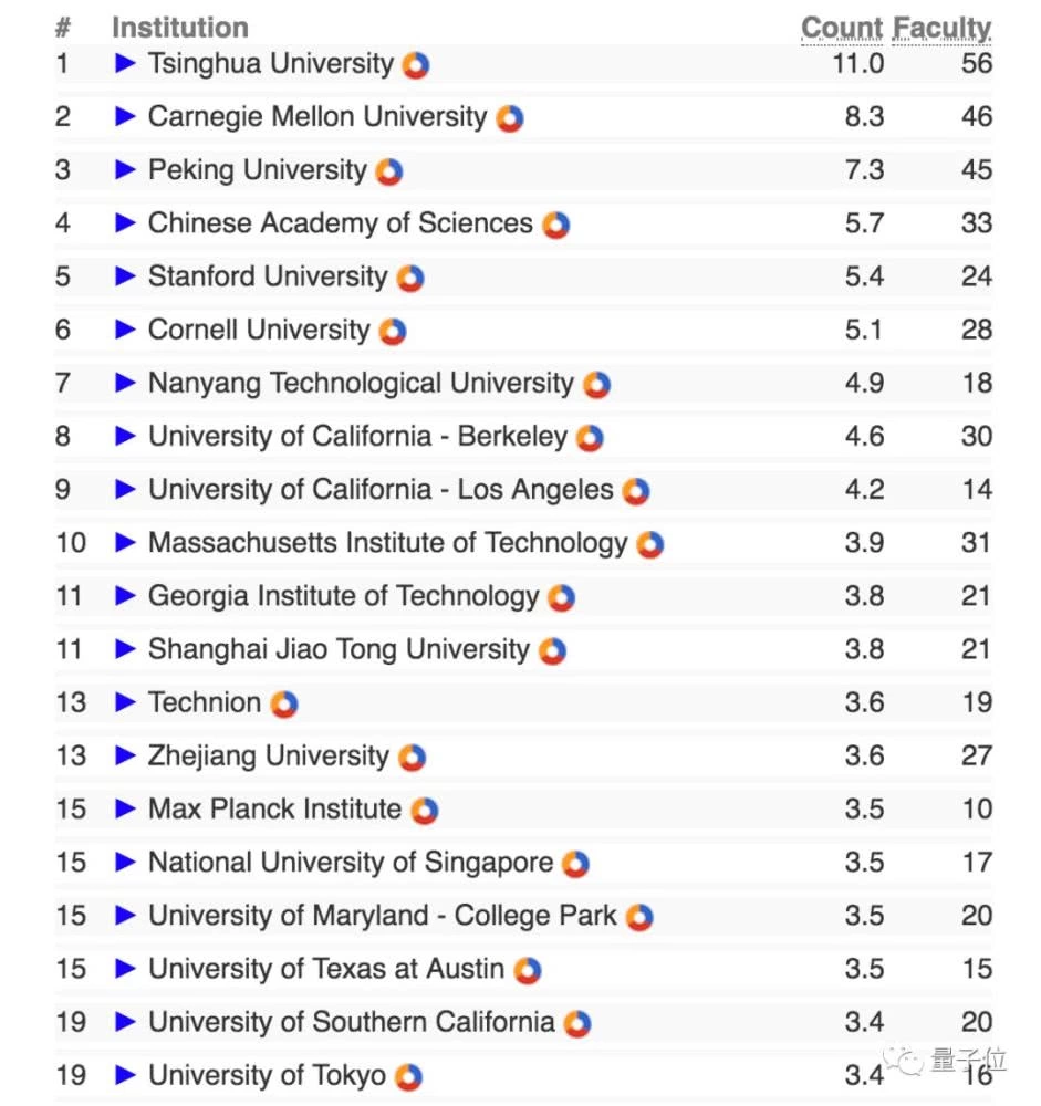 这些,只是近10年来的平均,单看2018年这一年的战绩,在全球高校中,清华大学的AI实力已然超过CMU、MIT等国外名校,位列全球第一: