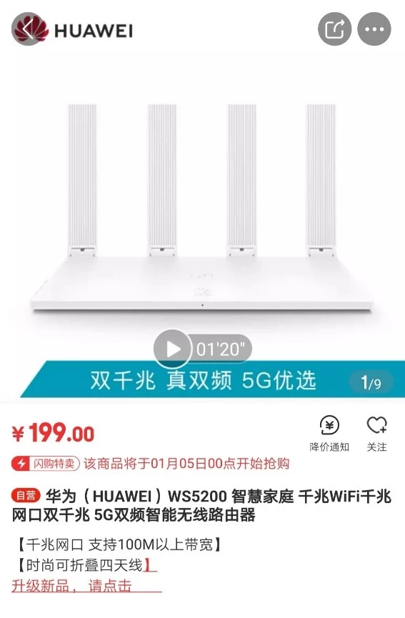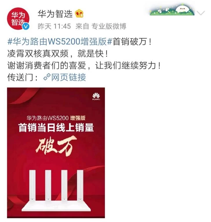 1月3日,华为智选官方微博宣布,华为路由WS5200增强版首日线上销量突破一万台,可谓新年开门红。前代华为路由WS5200全渠道销量突破300万台,以高达20.2%的市场份额名列GFK 2018Q3 200-500元档位路由器线上销量第一名,华为路由WS5200增强版首销当日就取得如此成绩,可谓延续了前代的“爆品”势头,不禁让人对于这款增强版路由器的销量又多了几分期待。