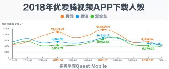 用户对平台竞争的体感如何,会直接用手机投票。根据QuestMobile的数据显示,2018年1月到11月,iOS端和安卓端App下载量中,优酷领跑行业。虽然12月的数据还没出,但前11个月的数据基本能给过去一年三家的竞争定性:话题度高的平台不见得用户买单,以及优爱腾三家仍然处于同一个水位。