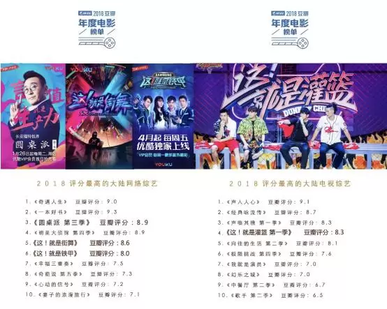 具体到单个平台来说,爱奇艺过去一年贡献了《偶像练习生》《延禧攻略》两个话题度爆表的作品。但这两部话题之作的热度越高,就越衬托出爱奇艺整体内容的“营养不良”。《热血街舞团》《机器人争霸》在和优酷的对打中差距明显,后者两档节目在豆瓣的评分位列全年网综口碑榜top10,是榜单上唯二的头部网综。剧集上,除了《延禧攻略》,能给用户留下印象的寥寥。木桶效应在爱奇艺体现的尤为明显。