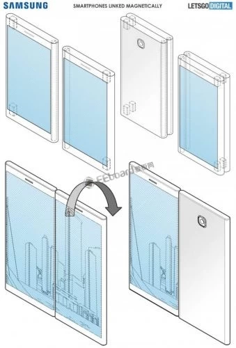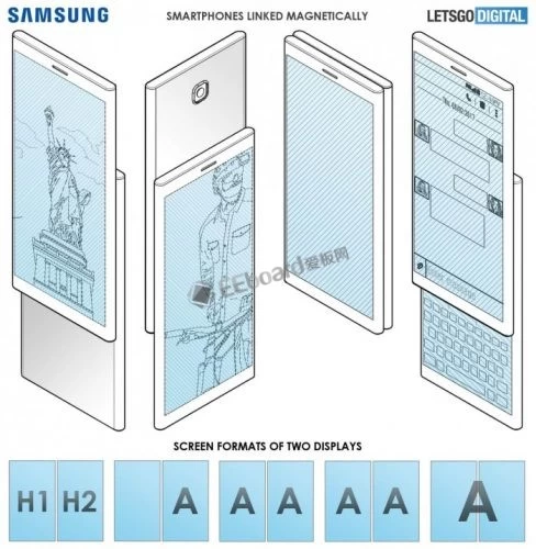 名为“带有两个显示设备和操作方法的电子设备”的专利于2018年7月由三星提交,并于2019年1月3日由WIPO授予。该专利显示两个显示器可以使用磁铁连接作为大型显示器工作。这两个显示器具有自己的处理器和其他组件,可以单独使用,也可以一起使用。这将允许用户拥有具有灵活屏幕的智能手机,该智能手机可用作平板电脑或用作第二屏幕。这两种设备都有三个磁铁,可以让它们相互粘在一起,并用作一个大屏幕。