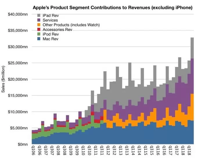 苹果公司在全球范围内销售XR的麻烦似乎也超出了预期,波动的货币汇率也在肆虐 - 更不用说贸易战了 - 但Asymco的分析师Horace Dediu认为Apple从非iPhone硬件中获得了强劲的收入,他最近在Twitter上分享的图表显示: