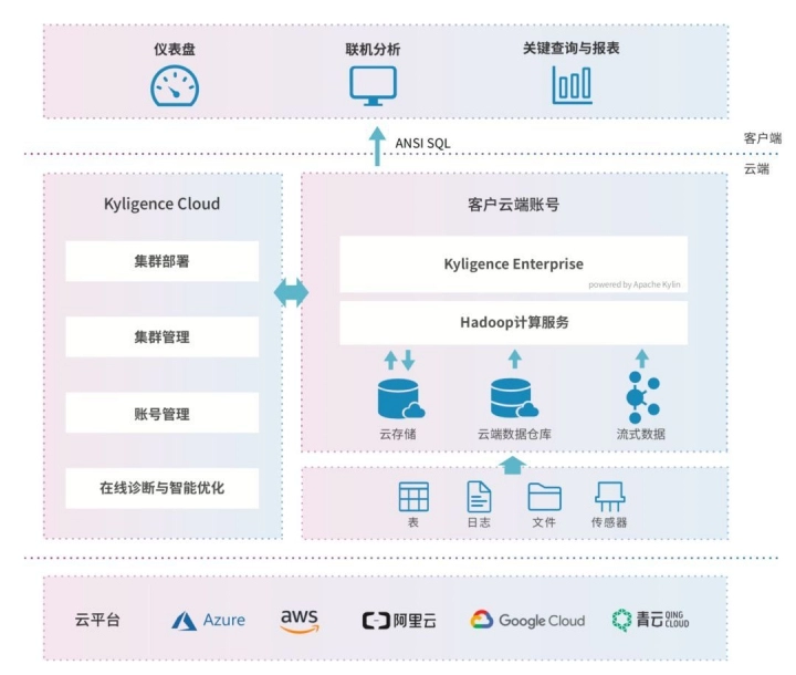 Kyligence从成立之初即在云端进行相应布局,2017年底推出了KyligenceCloud产品。Kyligence Cloud是Kyligence公司基于云端的大数据服务,为客户将大数据分析平滑上云提供解决方案,目前已支持全球超过6个云平台。