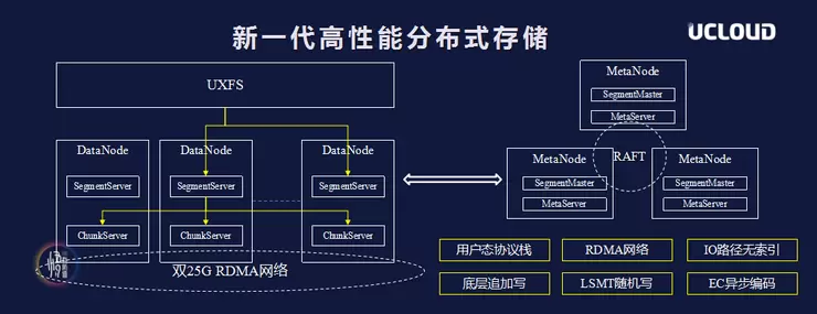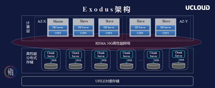 总体来说基于传统的分布式存储方案可以实现无线扩容问题,但它的缺点是协议无法兼容,且存在分布式事务和分布式Join难题。在这样的背景之下,UCloud基于高性能分布式存储架构,通过融合最新软硬件技术,着手研发新一代公有云分布式数据库Exodus。