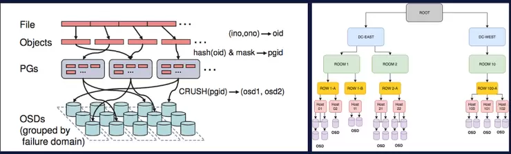 企业级IT场景下,数据分布算法包括Dynamo、Ceph的CRUSH、Gluster的Elastic Hashing以及Swift的Ring等。这些算法都有相似的特点,首先它们都是基于/借鉴一致性哈希,增加/减少节点时数据迁移量小。其次,引入对数据中心物理拓扑的建模(Cluster Map),数据多副本 / EC分片跨故障域 / 可用区分布。另外,这些算法还可以对节点划分权重,数据分布和容量/性能匹配,辅助扩容。