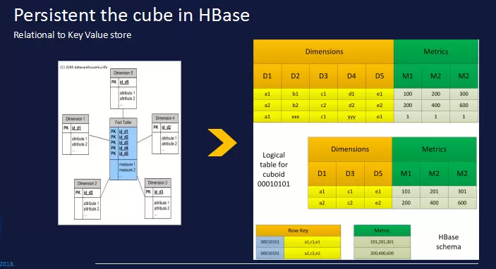 如下图所示,Kylin基于HBase的列式存储,计算结果集保存在HBase中,原有的基于行的关系模型被转换成基于键值对的列式存储,维度组合作为Rowkey,查询访问不再需要昂贵的表扫描,维度值通过编码算法(字典、定长、时间戳等)高度压缩,指标通过Column存储,可以灵活、无限制的增加指标数量,此外,预先计算的结果也为高速高并发分析带来了可能。