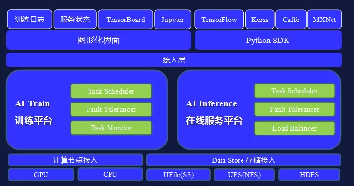 基于以上五大要素,UCloud构建了自有的AI基础平台,里面包含AI Train和AI Inference两大核心服务。如下图所示,最上层最侧是训练日志、服务状态、TensorBoard框架和Jupyter,下面接着就是图形化界面,这里面主要是完成一些基本的部署操作,右侧是Python SDK接口,接入层下面即为平台核心的AI Train和AI Service,最底层封装了所有的计算节点和存储接入。