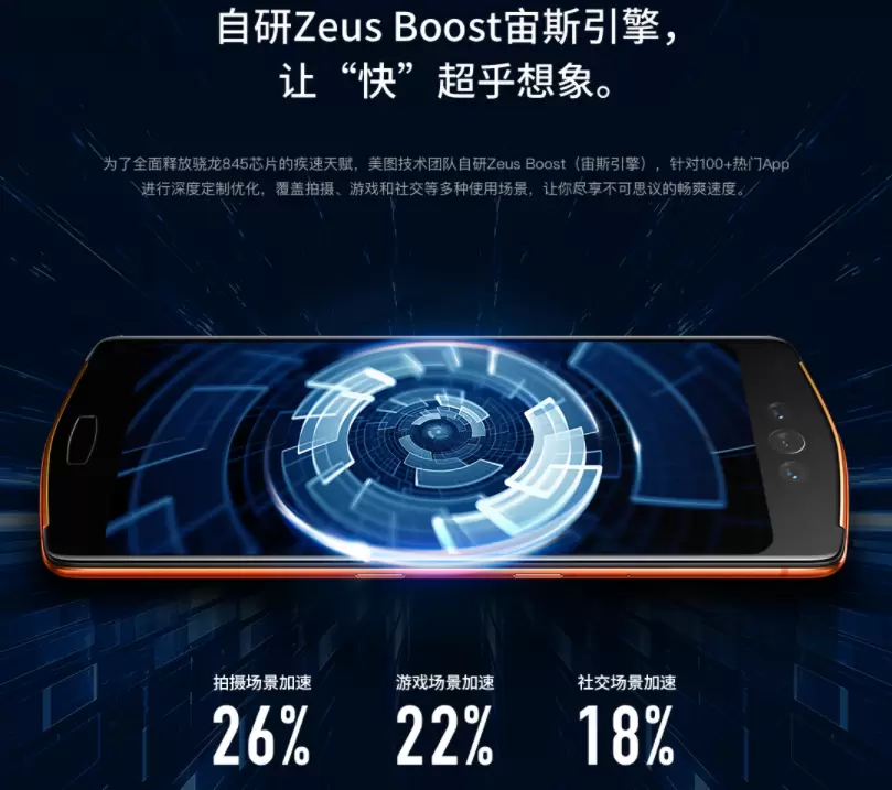 游戏影音等娱乐体验方面,美图V7也针对性地进行了优化。为了充分释放骁龙845芯片的疾速天赋,美图技术团队自研Zeus Boost(宙斯引擎),针对100+热门App进行深度定制优化,覆盖拍摄、游戏和社交等多种使用场景;专为游戏而生的MTgame再次升级为MTgame3.0,大型游戏疾速运行不卡顿,游戏加速22%,大幅提升游戏体验。