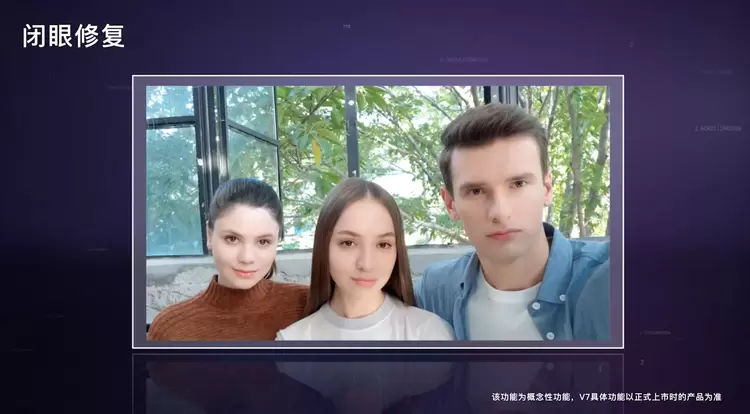 美图V7的闭眼修复模式可以利用AI技术捕捉脸部信息,当检测到有人闭眼时,将自动为TA替换最佳表情,若该功能上线将完美解决聚会合影难题。