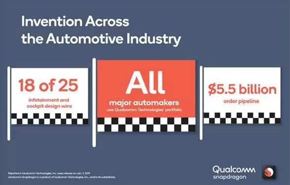 早在2014年,高通便推出了初代骁龙汽车平台602a,2016年则迭代升级支持LTE连接的骁龙汽车平台820a。根据官方最新的资料,高通当前已经赢得全球领先的25家汽车制造商中18家的平台项目(信息影音及数字座舱系统),订单总估值不到1年时间已增长至超过55亿美元。