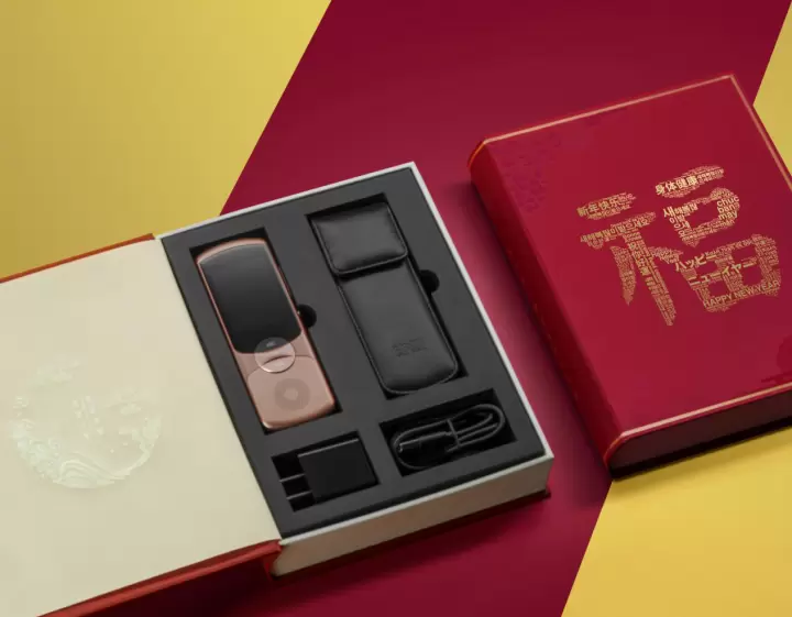 不仅颜值无懈可击,“新译”礼盒的内在更是让人惊喜。礼盒分为两层,一层为“新译区”,放置讯飞翻译机2.0,机体星辰黑、樱花粉、香槟金三色可选,满足不同需求。另一层为“心意区”,配有给翻机量身定做的高级皮套,以及黄铜书签、新年红包。