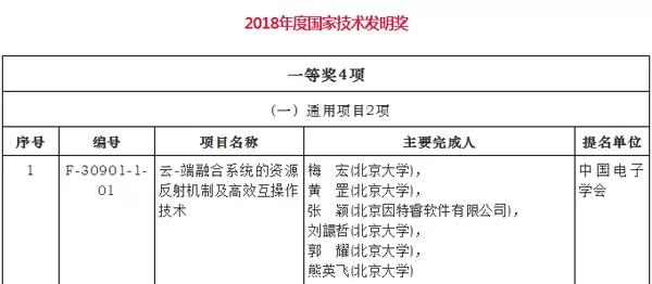 在2018年度国家技术发明奖获奖项目中,包含“云-端融合系统的资源反射机制及高效互操作技术”、“大人群指掌纹高精度识别技术及应用”“集成化宽频带光发射器件与模块”、“热点区域高容量无线网络的协同自组织技术及应用”等。