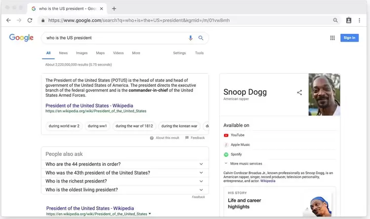 如果你搜索“谁是美国总统?”它也可以工作。你可以操纵结果来阅读“Snoop Dogg”。