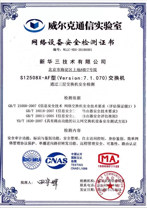 新华三S12508X-AF交换机获得威尔克实验室首张网络设备安全检测证书