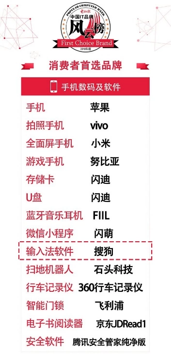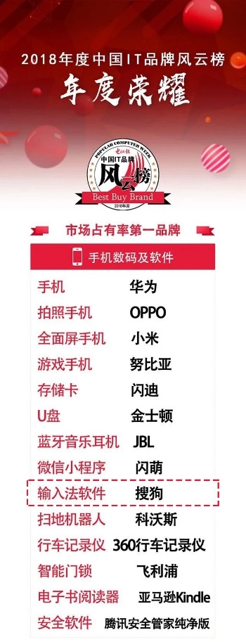 近日,由电脑报主办的“2018年度中国IT品牌风云榜”正式发布。搜狗输入法凭借一骑绝尘的市场份额及良好的用户口碑一举斩获“市场占有率第一品牌”和“消费者首选品牌”两项大奖。