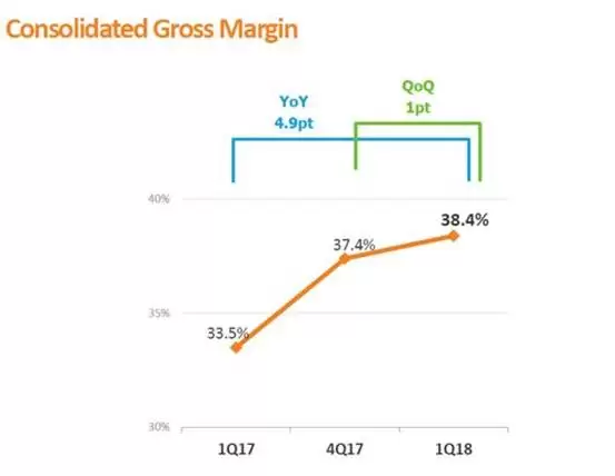 众所周知,毛利率是评判一家企业盈利水平和财务健康度的重要指标,而且毛利率的表现也对企业的长远发展有着重要影响。近日,联发科公布2018年第一季度财报。该季财报最大的亮点是,毛利率上升至38.4%,较去年第四季度和去年同期的均有明显的提升。据分析,这一方面得益于Helio智能手机芯片的良好表现,另一方面归因于成长型业务出货量持续增长。