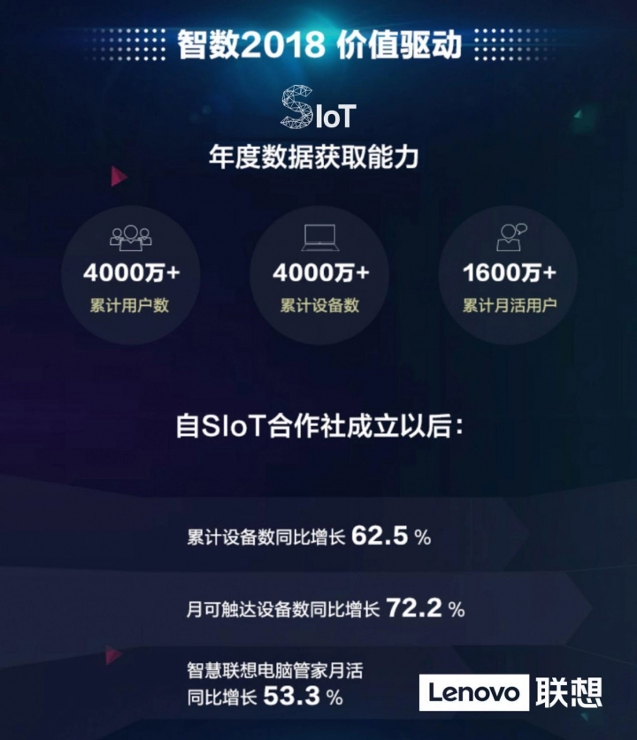 受开放SIoT生态的影响,截止2018年12月31日,联想的SIoT云平台累计用户数达到了4000万+;累计设备数达到了4000万+,其中累计月活用户达到了1600万+;同时自SIoT合作社成立以后,SIoT云平台累计设备数同比增长62.5%,月可触达设备数同比增长72.2%,而且智慧联想电脑管家月活同比增长53.3%。这是联想SIoT云平台受行业认可的标志,是联想SIoT云平台通过“loT设备引擎、联想红盾安全体系、智慧联想、联想服务体系、LCUI语音引擎”五大基石不断打磨商业价值的体现,更是联想SloT云平台通过“产品、渠道、服务、AI、资本”五大赋能催化的智慧物联效应,尤其是此次“2018中国最有影响力物联网云平台企业”大奖的颁布,行业及媒体都在鼓励着联想SIoT云平台砥砺前行的脚步。