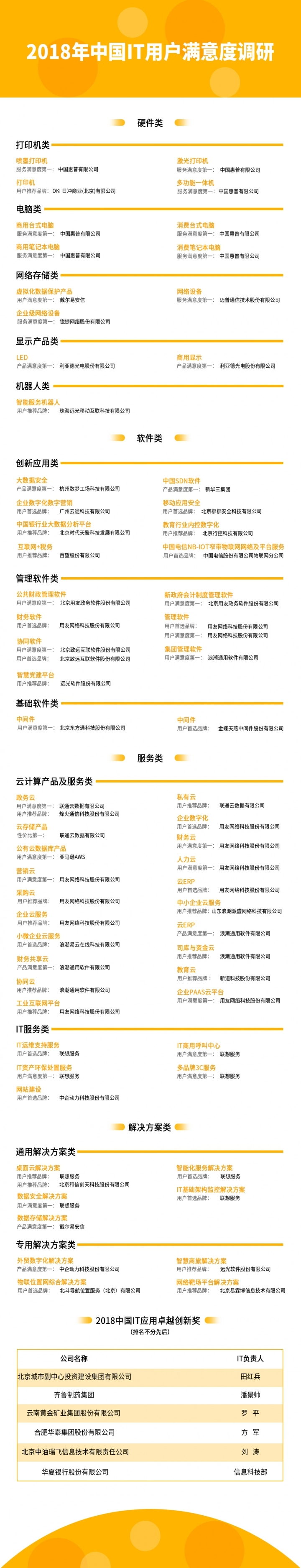会上还颁布了硬件及软件、IT服务及解决方案等领域的满意度调查结果,并从用户满意度、产品满意度、服务满意度、品牌忠诚度、用户首选品牌等多个维度评选出了2018年中国IT用户满意品牌。其中,硬件及解决方案类用户满意品牌包括:惠普、戴尔EMC、新华三、烽火、和信创天、迈普、锐捷网络、利亚德、OKI、北斗导航、百望股份、远光软件、行控科技等;软件和服务类用户满意品牌为:联通云数据、亚马逊AWS、用友、联想服务、浪潮、东方通、金蝶天燕、致远互联、中企动力、远光软件、新道科技等;创新领域类用户满意品牌是:用友、浪潮派盛、数梦工场、云徙科技、梆梆安全、中国电信物联网公司、易霖博、时代天鉴等等。