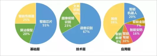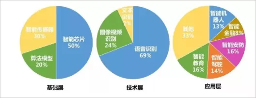 市场规模方面,智能芯片在基础层产业中占比最大为9.1亿美元,智能传感器和算法模型分别达到4.2亿美元和3.3亿美元,整体产业结构与全球特征趋势匹配;技术层方面语音识别占据了绝大部分市场份额,达到16.2亿美元,图像视频识别市场规模居中为5.5亿美元,而文本识别市场规模只有2.4亿美元左右,仍存在相当的发展潜力;由于国内市场特定的场景需求与消费习惯,智能机器人和智能安防等产业发展较快,领跑应用层市场,分别达到8.5亿美元和6.8亿美元,智能驾驶产业规模达到4.2亿美元,发展态势良好,未来有望进一步提高市场份额。