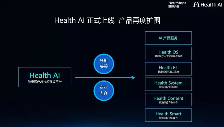 面向广阔的B端市场、不同类型的健康服务智能升级需求,Health AI开放平台会提供基于健康医疗需求的AI产品服务、人工智能操作系统Health OS、机器人系统Health RT、管理系统Health System、专业内容Health Content、智能硬件等赋能产品及服务。
