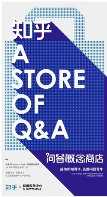 知乎选择在5.4青年节开业“A store of Q&A”问答概念店,除了借势青年节这一近些年逐渐走红的节庆热点外,也和前不久发布的品牌视频形成了声量衔接。而选择北京悠唐购物中心作为首发预热站,也是因为悠唐是都市白领青年的娱乐生活“聚集地”,这里聚集着相比周边地区更蓬勃的“好奇心”。