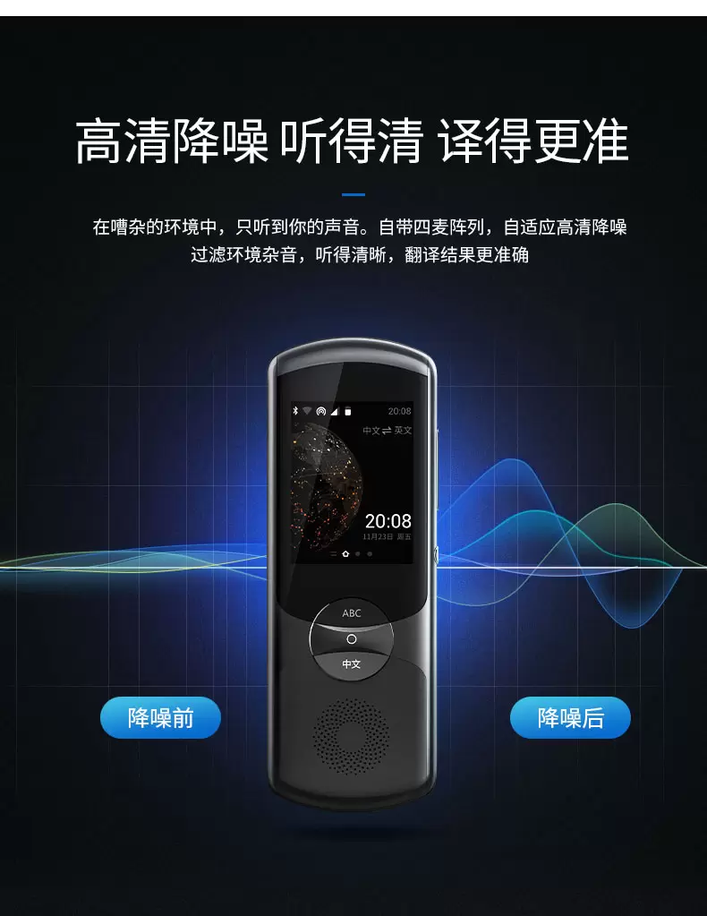 首先,实际使用场景中周围的环境可能会很嘈杂,而翻译APP受限于手机麦克风的配置,没有降噪技术,无法准确拾音;而讯飞翻译机专注于翻译场景,充分考虑到了使用环境的嘈杂性,采用自适应四麦克风高清降噪,抑制周边噪声并提高远场识别的准确率。