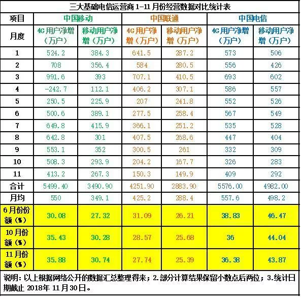 每个花样卡的背后都意味着中国联通划出了特定的用户需求网格。用户需求网格本来就不容易界定。处于需求网格中心位置附近的用户相对可以更容易选择,那么处于需求网格边缘的用户该怎么办呢。我们推测,在选与不选之间,便宜与否之间,用户的各种被套路的担心和怀疑是非常大的。即便设计花样卡的目的和初衷是为了提升用户的获得感,但是现在花样卡已经有意无意之间给用户带来了选择困难。不管中国联通是否愿意承认,至少这样的现实可能性是存在的。即便是2018年风靡全国并且异常火爆的腾讯王卡,虽然通过上山下乡收割了大量年轻人的流量,但是实际上也并没有给中国联通带来多少用户增长。这个数据我们可以从三大运营商的月度经营报告中用户增长数据予以间接证实,详见下表。其他的市场热度效果远不如腾讯王卡的各种花样卡效果会有多好呢?具体数据虽然我们不得而知,但是高开低走,中国联通后劲不足的趋势是非常明显的。