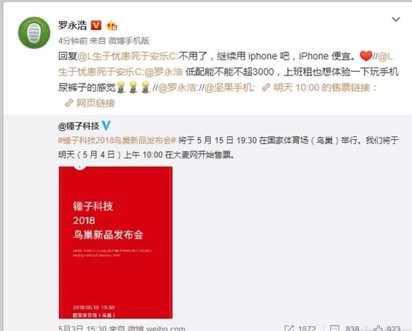 纸尿裤手机不便宜 罗永浩劝网友继续用iPhone