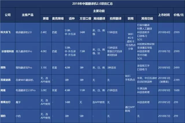 2018年是新机型喷发之年,不但有新品牌亮相,先期入驻市场的科大讯飞、清华准儿、搜狗、网易有道等也纷纷推出2.0新品:4月科大讯飞推出晓译2.0,9月搜狗推出翻译宝Pro、网易有道推出翻译王Pro,清华准儿在7月、11月分别推出准儿Pro、Go、Fly三款机型。