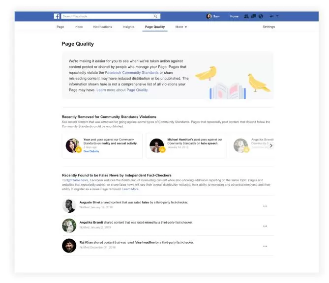 该选项卡还将告知页面管理员哪些内容可能已被Facebook算法降级,如果没有完全删除。这包括被独立的事实核查组织发现为虚假新闻的内容。几年前Facebook开始对clickbait采取行动,然后开始标记并降低假新闻,因为这基本上成了新的clickbait。
