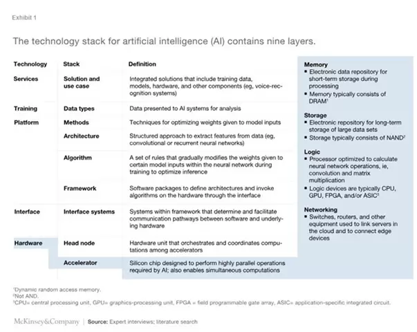 要了解AI为半导体公司创造机会的原因,请考虑技术堆栈(图1)。它由9个独立的层组成,支持AI应用程序的两个活动:培训和推理。当开发人员试图改进培训和推理时,他们经常遇到与硬件层相关的障碍,包括存储、内存、逻辑和网络。通过提供下一代加速器架构,半导体公司可以提高计算效率或促进通过内存和存储传输大型数据集。例如,AI的专用内存带宽是传统内存的4.5倍,因此更适合处理AI应用程序所需的大量数据。这种性能的提升是如此之大,以至于许多客户更愿意支付专用内存所需的更高价格(每GB大约25美元,标准内存大约8美元)。