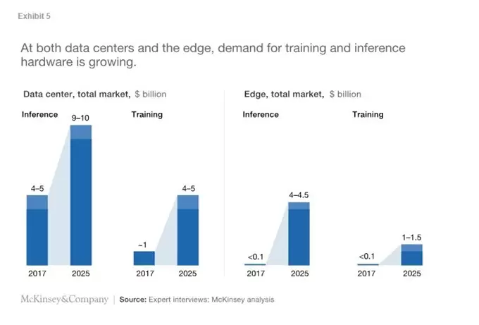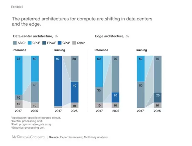 总体而言,到2025年,对计算硬件的需求将增加约10%至15%(图表5)。在分析了超过150个DL用例之后,考虑了推理和培训要求,我们能够确定架构最有可能在数据中心和边缘获得优势的(图6)。