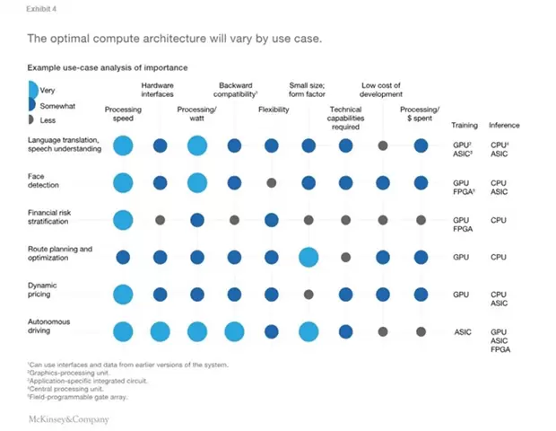 计算性能依赖于中央处理单元(CPU)和加速器 - 图形处理单元(GPU)、现场可编程门阵列(FPGA)和专用集成电路(ASIC)。由于每个用例都有不同的计算要求,因此最佳的AI硬件架构会有所不同。例如,与自动驾驶或财务风险分层的应用相比,路线规划应用对处理速度、硬件接口和其他性能特征有不同的需求(图表4)。
